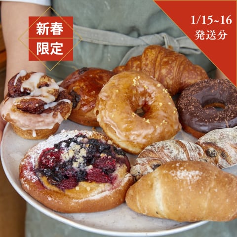 2026年初めのおまかせパンBOXは、ユニバーサルベイクスからのお年玉つき!ユニバーサルベイクスのパン8種に加えて「紅白ピーカンスノーボールクッキー /1袋」が入ります。おまかせパン8種の中には当店人気の「あおさの塩パン」が必ず入る、通販限定のお得なBOXです。ぜひこの機会にお試しください!