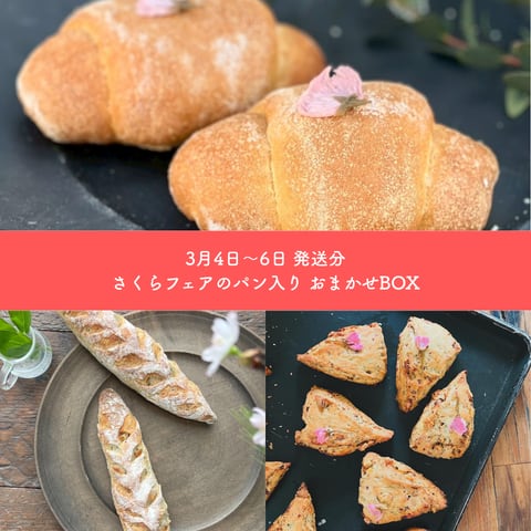 今回は、3月より店頭販売がスタートする「桜フェア」の商品3種(塩パン桜あんバター、さくらとくるみのバゲット、桜のスコーン又は桜のマフィン)と、人気のお食事パンや菓子パンを詰め合わせたBOXをご用意しました!